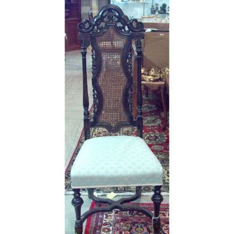 The shaped backs with carved splats above stuffed overseats raised on turned legs joined by wavy X-shaped stretchers terminating on trefoil feet. H: 50 in.