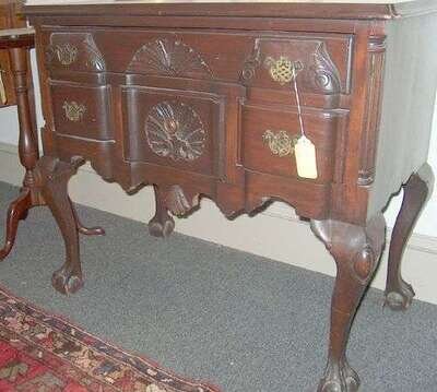 Square molded top over column-form shell and scroll supports with three carved conforming drawers and apron ending on ball & claw feet. H: 30, W: 34, D: 19 in.