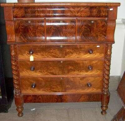 The inverted breakfront top above arrangement of four ogee-moulded drawers above three long graduated drawers flanked by spiral-turned pilasters on turned feet. H: 58 1/2, W: 51, D: 21 in.