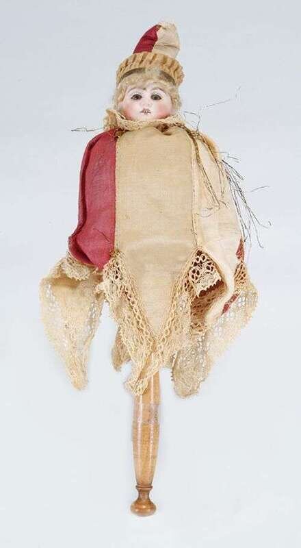 Bisque head spinning jester doll, hand-painted face, pen mouth, lace details on outfit. H: 12 in.
