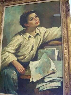 Oil on canvas, depiction of a boy with papers. In an ornate gilt frame signed. 42 x 31 in.