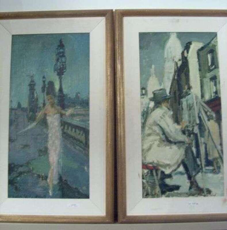 Parisian street scene, depicting a woman in a white evening dress, signed indistinctly, Paris. '63. 30 x 18 in.; together with Parisian street scene of painter by the same hand.