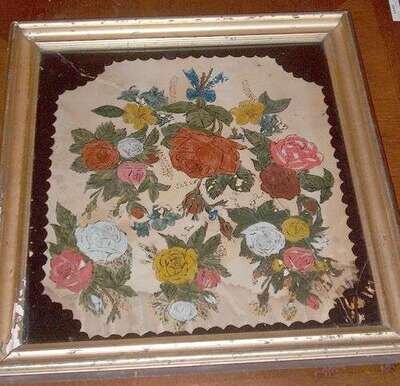 Still life, with reverse painted roses and peonies with black-painted scalloped border in gilt frame. H:18 1/2 in. x W: 16 1/2 in.