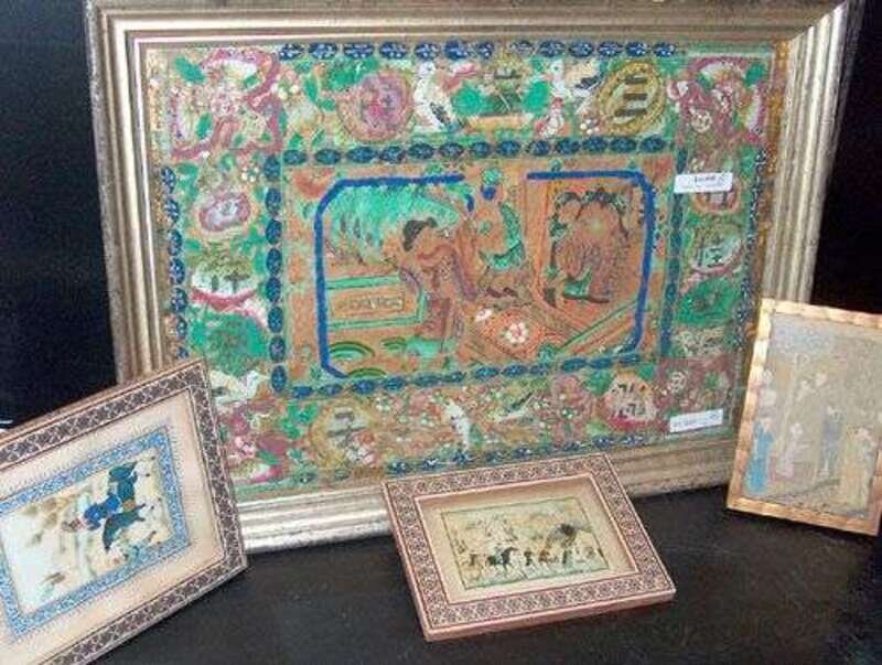 TWO CHINESE FIGURAL PAINTED & PAPER-CUT COLLAGES, AND TWO PERSIAN MINIATURE PRINTS