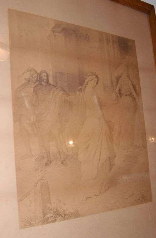 Shakespearean tale with a woman in a flowing dress. Blindstamp to lower right. H: 38 1/2 x W: 31 in.