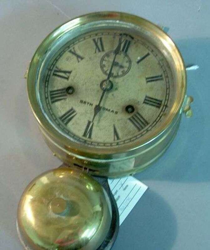 With round etched key-wound dial enclosed in glass case with bell at base. Mounted on board with label verso. H: 10 1/2, W: 7, D: 3 1/2 in.