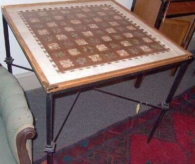 With shell and wood inset lattice design top over iron cast legs and stretcher. H: 30 in x W: 31 in.