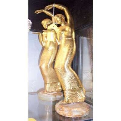 Brass on alabaster bases, depicting dancers in the Egyptian style of the period. H: 15 1/2 x W: 4 1/2 in.