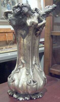 Ornate Art Nouveau-style vase with female bust moldings on bulbous leaf -decorated base. H: 16 1/2 x W: 9 in.