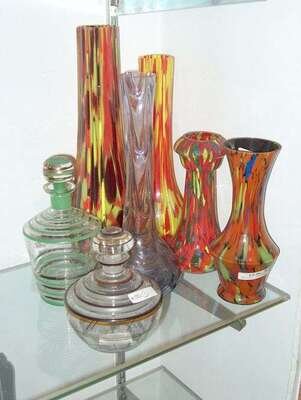 Seven pieces, including four multicolored spot vases, a violet vase, and two hand-painted stoppered bottles. Various sizes.