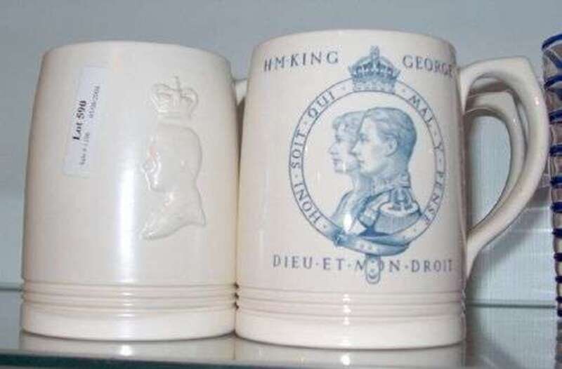 Glazed ceramic; six pieces, including three commemorative mugs, two jiggers, and an egg cup.