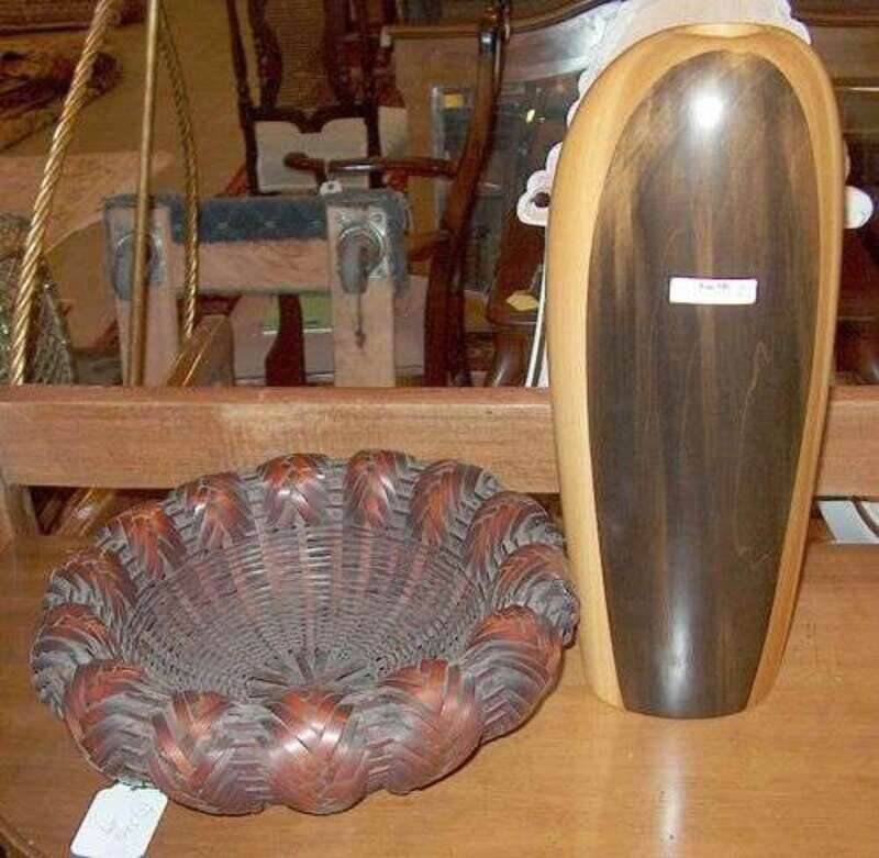 SCULPTURAL TURNED WOOD VASE & JAPANESE BAMBOO BOWL