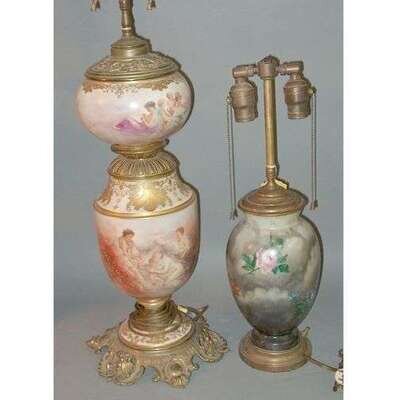 With floral putti and maiden decorated bodies with gilt accents on brass bases. H: 33 and 20 in.
