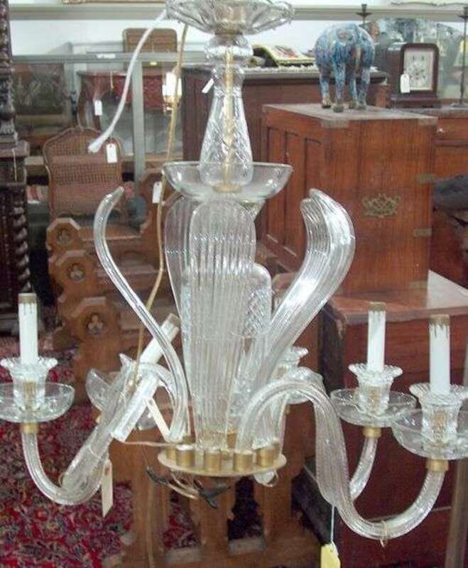 Cut glass urn-form center support with free-form design "leaves" surrounded by five scroll light supports. H: 21 in. x W: 28 in.