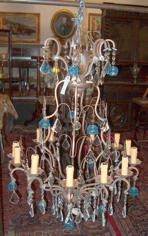 Multi-level prism chandelier with various teardrop and blue molded ball prisms on a white metal scrollwork frame.
