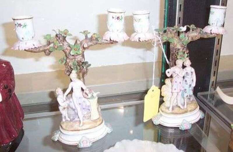 With twin floral decorated holders with branch and trunk-form supports with figures, on raised plinth base. H: 8 1/2 in.