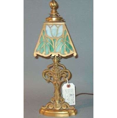 Stylized shade with green slag glass over a brass cast support with a basket-of-flowers medallion. H: 16 in. x W: 6 in.