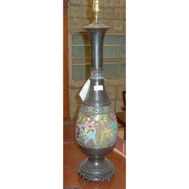 Of tapering form with raised enamel bands of floral and figural scenes on a wooden base. H: 36 in., base to top of harp.