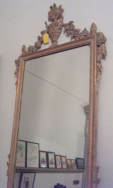 French style with central urn form cartouche supported by carved floral and swag decorations and urn corner finials. H: 51 in x W: 28 in.