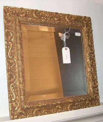Beveled glass mirror with scroll and ribbon border. H: 24 in. x W: 23 1/2 in.