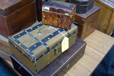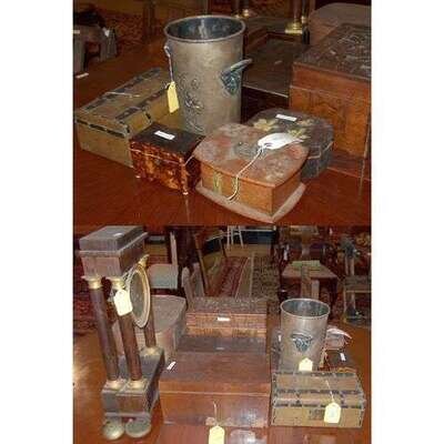 Lot of assorted wooden, leather and tortoiseshell boxes, together with mantel clock and Nouveau-style cooler.