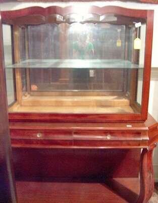 Square shaped top with glass shelf over two drawers, carved Deco-design supports with one shelf terminating on square feet. H: 66, W: 49, D: 50 in.