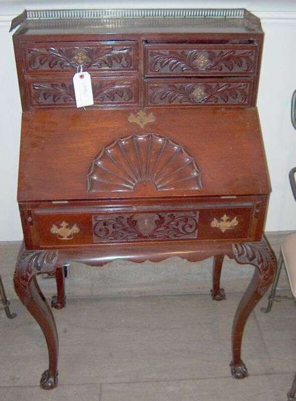 Brass galleried top with four carved drawers over a fitted interior. one drawer above carved apron terminating on cabriole legs and ball & claw feet. H: 45, x W: 29, x D: 18 in.
