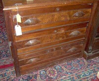 Thumbnail-molded top over three conforming drawers, carved leaf handles, over block base. H: 34, W: 39 1/2, D: 17 1/2 in.