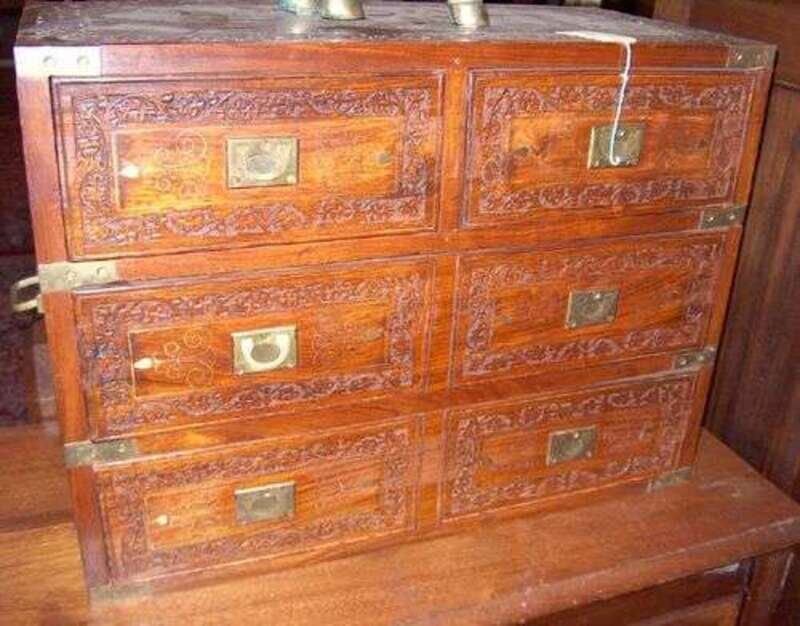 With carved & brass-inlaid top over six carved drawers, brass corner mounts and twin bail handles surrounded by inlaid vine designs. H: 18, W: 24, D: 12 in.