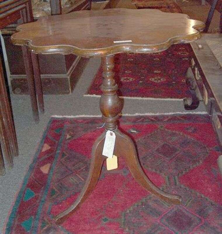 Scalloped edge, fan-design veneered top over turned urn-form support ending on tripod splayed legs. H: 27, W: 24 in.