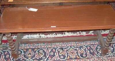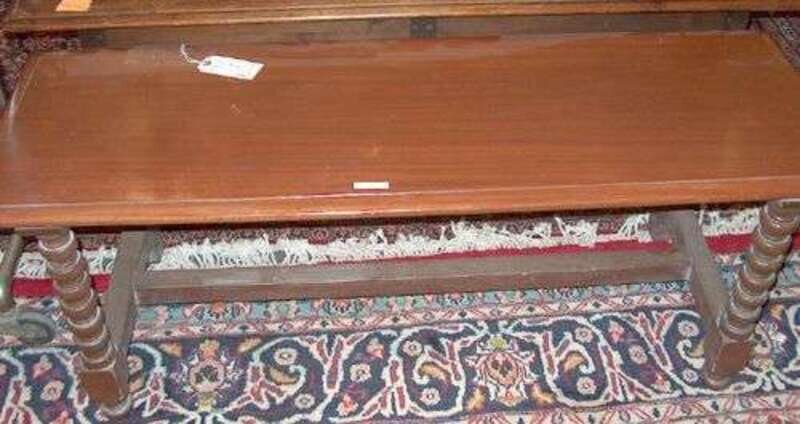 Of typical form with twist and turned legs. H: 20, L: 30, D: 12 in. and H: 18 1/2, L: 40, D: 16 in.