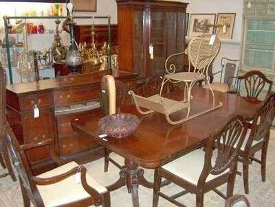 Sheraton style comprising china cabinet, double pedestal table, with one leaf, four side chairs and one armchair and server. H: of china cabinet 71, W: 45, D: 15 in.