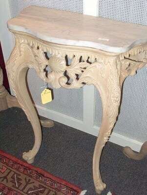 Round dish top over slender ring-carved support, acanthus-carved knees on pad feet. Marble-top console with carved and pierced apron and knees ending on cabriole legs and pad feet. Bleached mahogany finish. Pedestals H: 47 in., console H: 30 in.