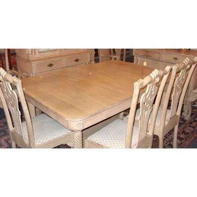 Of bleached mahogany with classical turned supports and legs on ball and claw feet. Consisting of dining table with two leaves, china cabinet and server, and two arm and five side chairs. Table H: 30, L: 90, W: 44 in. China cabinet H: 80, W: 43. Server H: 42 1/2, W: 28, D: 20 in.