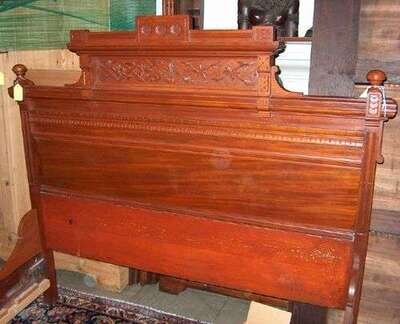 Consisting of full-size bedframe, marble-top three-drawer dresser with mirror back, and marble-top three drawer and one-door drysink. Bedframe H: 54 in x W: at base 57 in.
