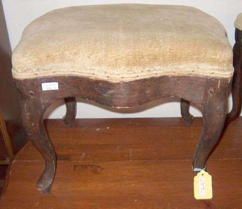 With green velvet upholstery over shaped bases and cabriole legs. H: 15, W: 17, D: 13 in.
