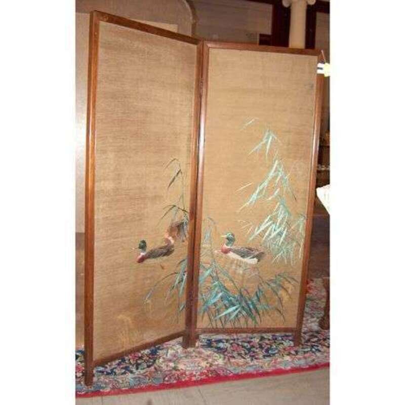Rosewood frame with two needlework panels of mallard ducks with bamboo leaf details. H: 66 in. x W: 51 in.