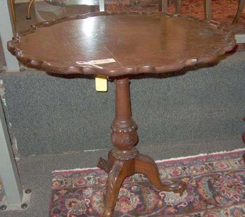 With stylized piecrust top over birdcage mechanism on turned and carved acanthus- leaf support and knees on cabriole legs ending on detailed ball & claw feet. H: 29 1/24, W: 30 in.