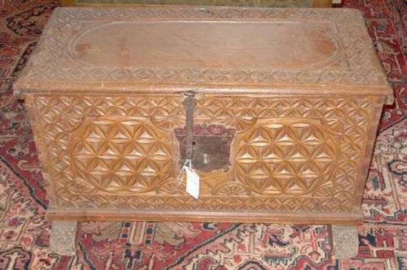 Carved rosette design lid and sides with one drawer interior flanked by twin twist iron handles over shaped carved feet. H: 20, W: 35, D: 17 in.