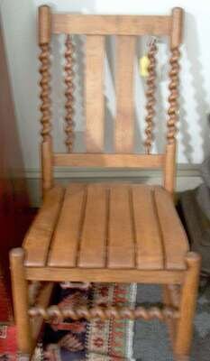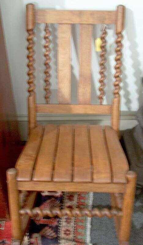With twist side supports and stretchers surmounted by a slat seat. H: 39, W: 18, D: 29 in.