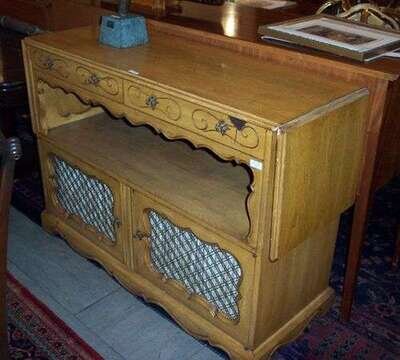 With lateral drop-leafs, the lower section cupboard doors opening to a void interior. Unextended: H: 36-1/2, W: 48, D: 18 in.