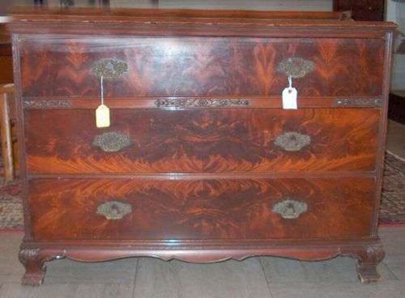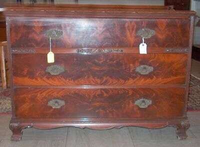 With square molded top over three conforming rosewood veneer drawers, shaped apron raised on carved feet. H: 37 x W: 47 1/2 x D: 20 in.