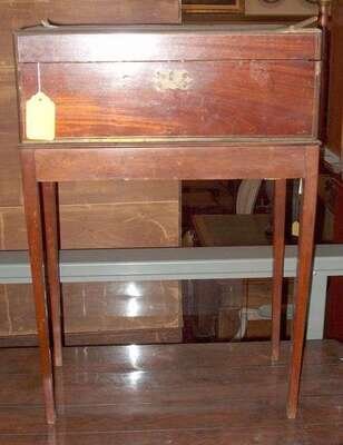 On stand with brass detail over leather top fitted interior and three-drawer secret compartment ending on slender tapered legs H: 26 in. x W: 17 1/2 in. x D: 10 in.