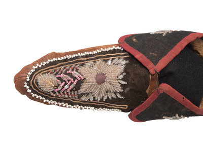 a pair of moccasins, floral designs on vamps; cuffs of wool and cotton