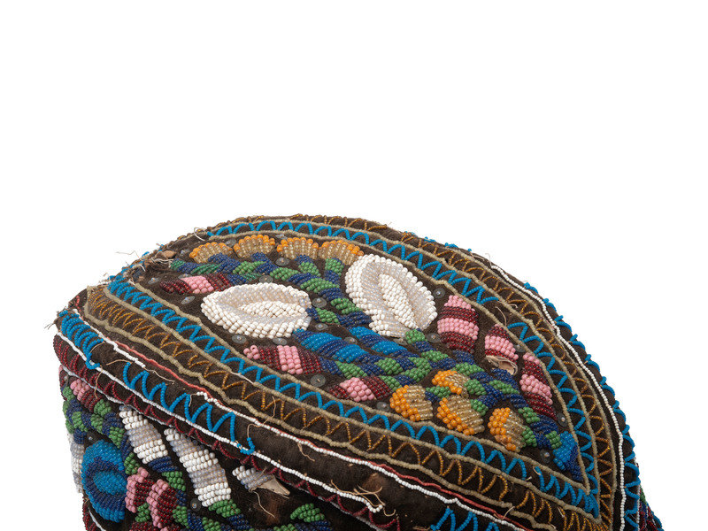 a Glengarry cap beaded using an assortment of colors creating floral and geometric designs