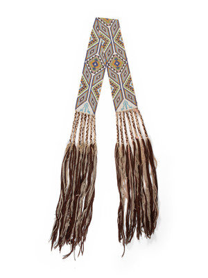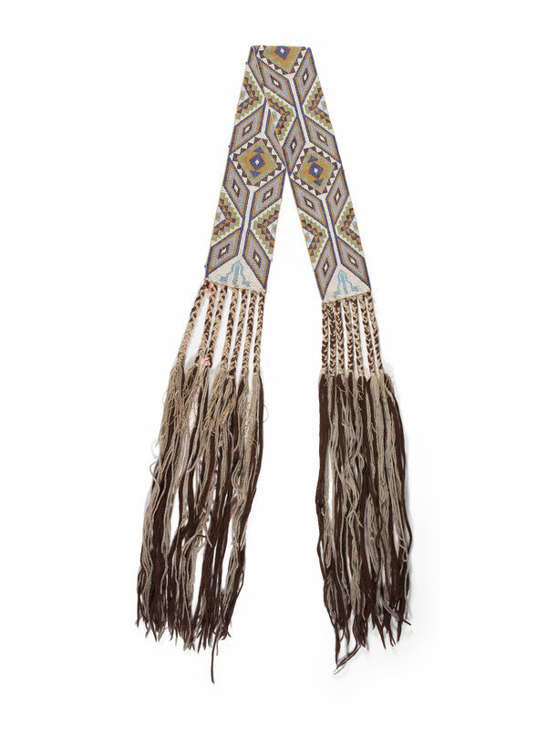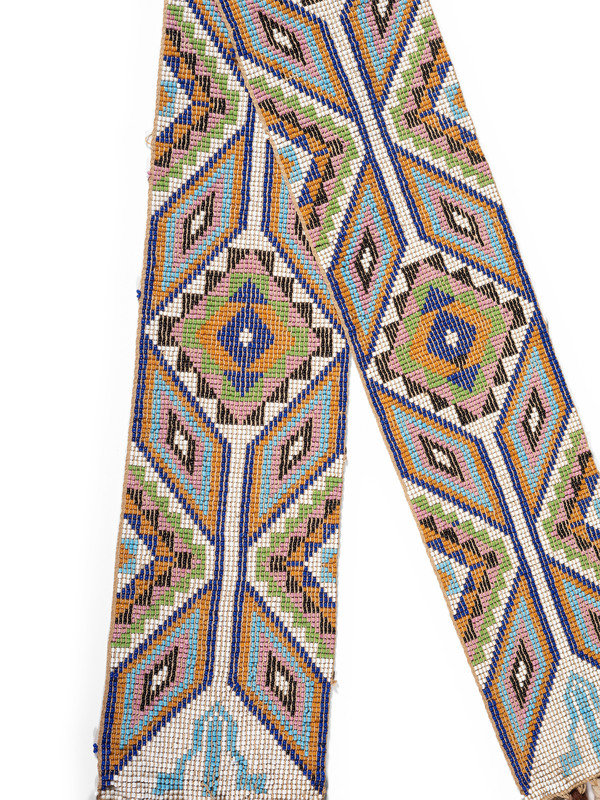 thread-sewn with loom beaded geometric design in colors of black, navy blue, pea green, pumpkin, pink, and light blue against a white ground; heavy amounts of braided wool yarn fringe line the lower edges