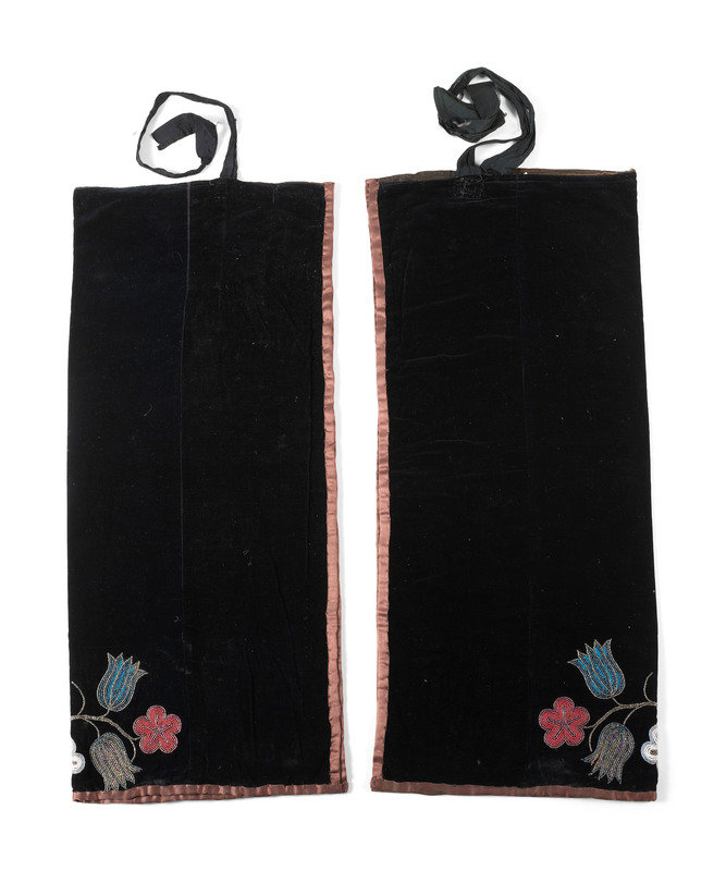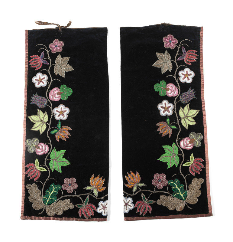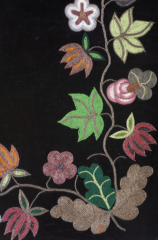 beaded on black velveteen with a vining floral pattern; satin ribbon edging; polished cotton lining