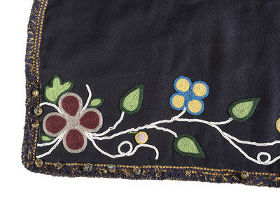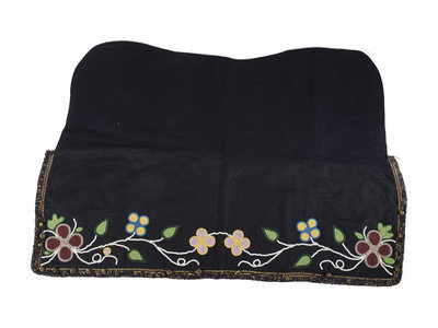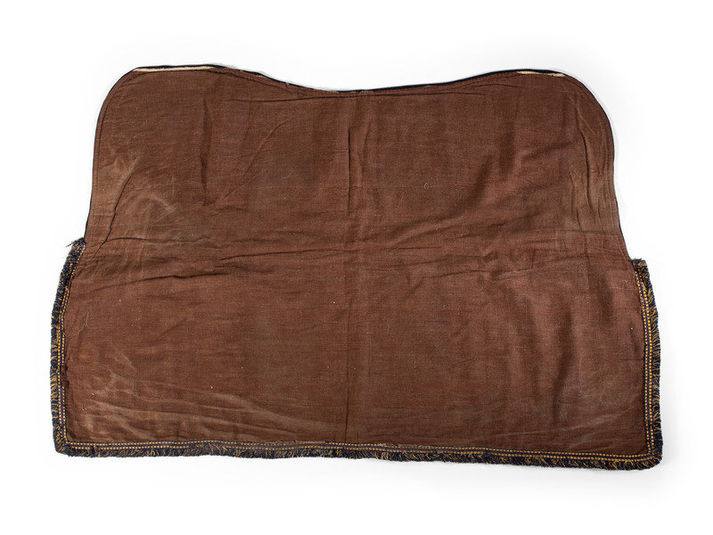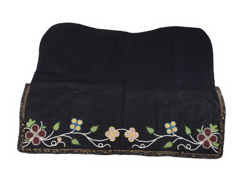 contoured form to an English saddle; thread-sewn on navy and black trade wool, lined with a brown cotton cloth; beaded floral design decorates the back edge in colors of translucent burgundy, translucent, white, translucent forest green, pea green, greasy blue, yellow, and light pink; further embellished along the edge with navy and gold fringe and brass bells