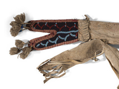 thread-sewn on hide; two beaded panels and forked drop lined with navy trade wool and edged with patterned cotton cloth, beaded floral design in colors of light blue, translucent red, opaque, pink, greasy blue, pea green, and greasy yellow; the lower edge decorated with hide things with yarn poms