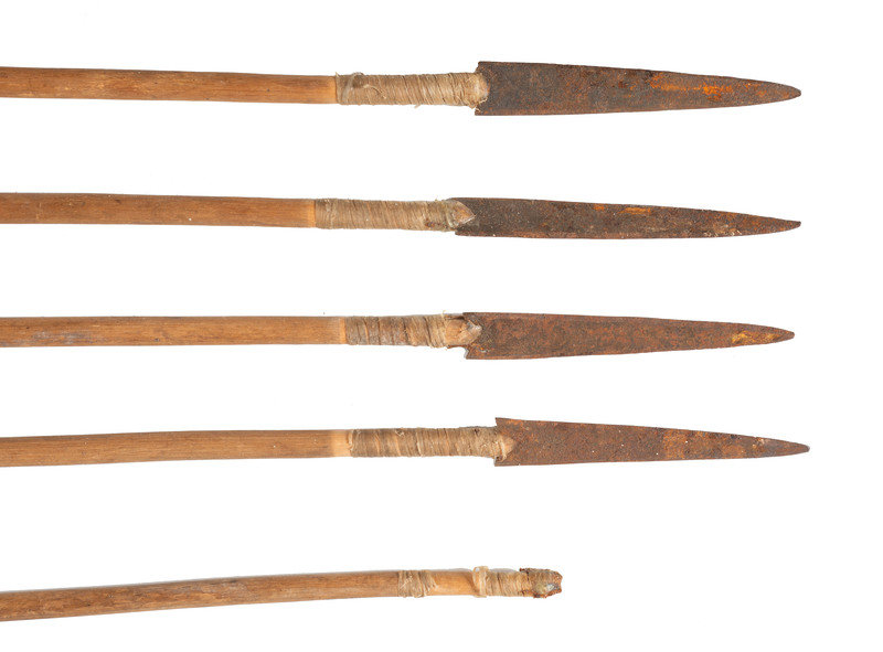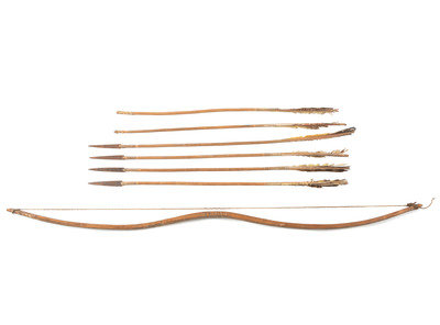sinew-backed recurve bow coated with red pigment; twisted sinew string